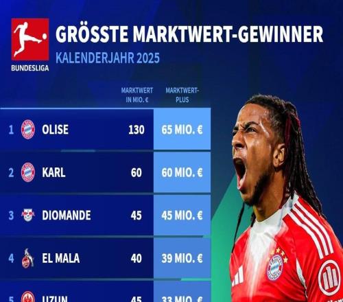 本周,德转盘点了德甲球员2025年身价上涨数据,拜仁边锋奥利塞本年度身价上涨6500万欧,高居榜首。小将伦纳特-卡...