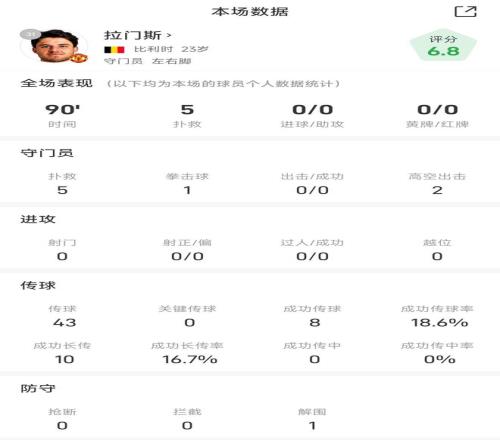 拉门斯战利物浦全场数据:贡献5次扑救助曼联客场取胜