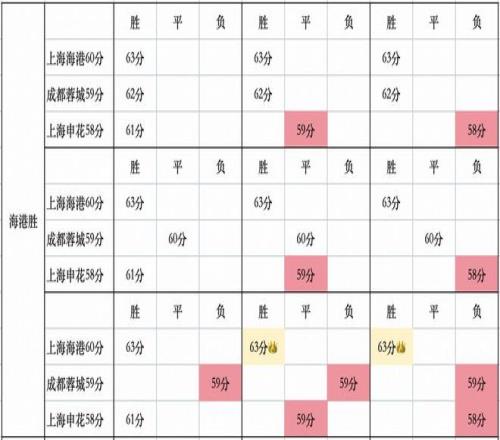 海港也有可能在今晚夺冠,前提是成都蓉城主场输给河南队(如果打平差3分,蓉城有交锋战绩优势),且申花主场不胜新鹏城。