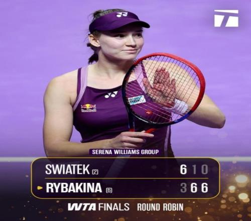 利雅得WTA年终总决赛单打小威廉姆斯组焦点战,莱巴金娜2比1送蛋逆转斯瓦泰克。6号种子莱巴金娜以3比6 6比1 6比0强势逆转2号种子斯瓦泰克,终结了本赛季对后者的四连败。她将年终小组赛战绩刷新为2比0,也将近期的连胜扩大到了八场。